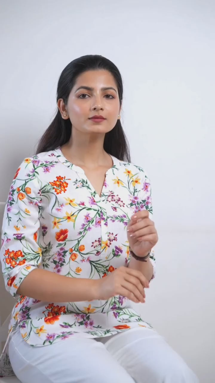 Embrace a vibrant style with this multicolor cotton tunic, adorned with beautiful floral prints. Featuring 3/4th sleeves and a flattering below-hip length, this tunic is perfect for adding a touch of elegance to your everyday look. Its soft, breathable fabric ensures all-day comfort, making it a must-have addition to your wardrobe.