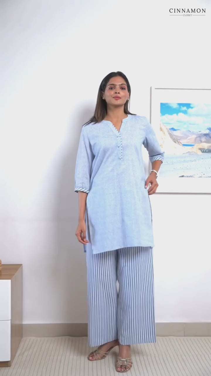 Embrace effortless elegance with our Light Blue Top and Light Blue Stripes Bottom Cord Set. This charming ensemble features a serene light blue top paired with matching bottoms adorned with subtle blue stripes, creating a cohesive and stylish look. Made from high-quality, breathable fabric, this set ensures comfort and a flattering fit for all-day wear. Ideal for a range of occasions, from casual outings to office meetings, this versatile outfit offers a perfect blend of sophistication and ease.