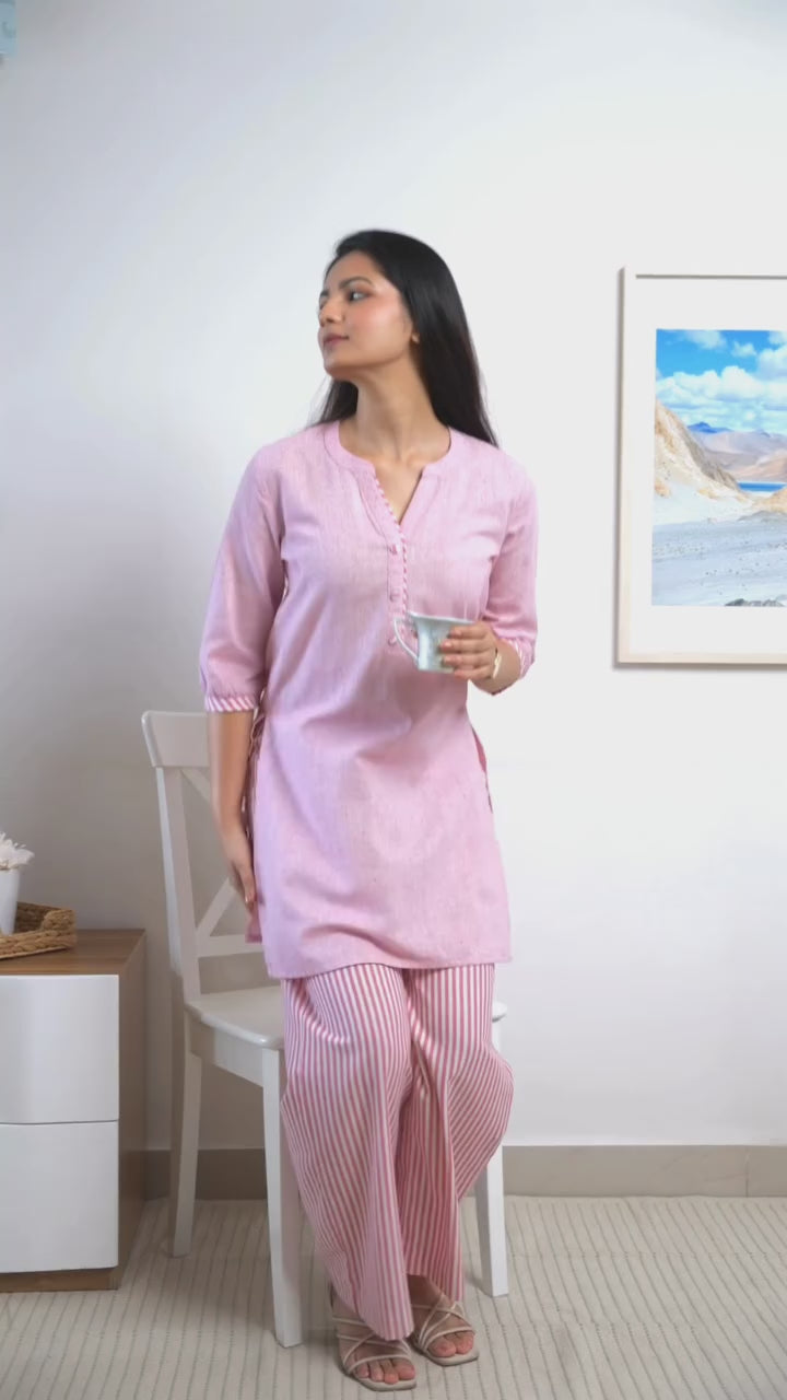Step into elegance with our Light Pink Top and Light Pink Stripes Bottom Cord Set. This delightful ensemble features a soft, light pink top paired with matching bottoms adorned with subtle pink stripes, creating a harmonious and stylish look. Crafted from high-quality, breathable fabric, this set ensures all-day comfort while providing a flattering fit. Perfect for various occasions, from casual outings to work meetings, this versatile outfit offers effortless style and chic sophistication.